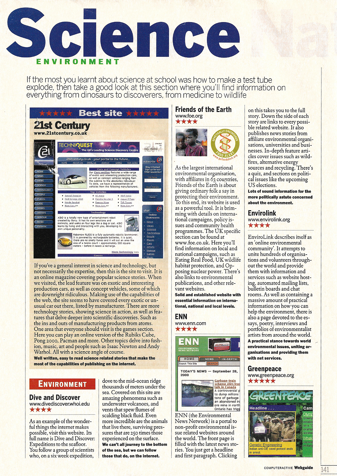 More accolades were to follow, and in Winter 2000 21st Century was voted Best site in the Science and Environment category of the Computer Active Web Guide, outperforming Friends of the Earth and Greenpeace, amongst others.
